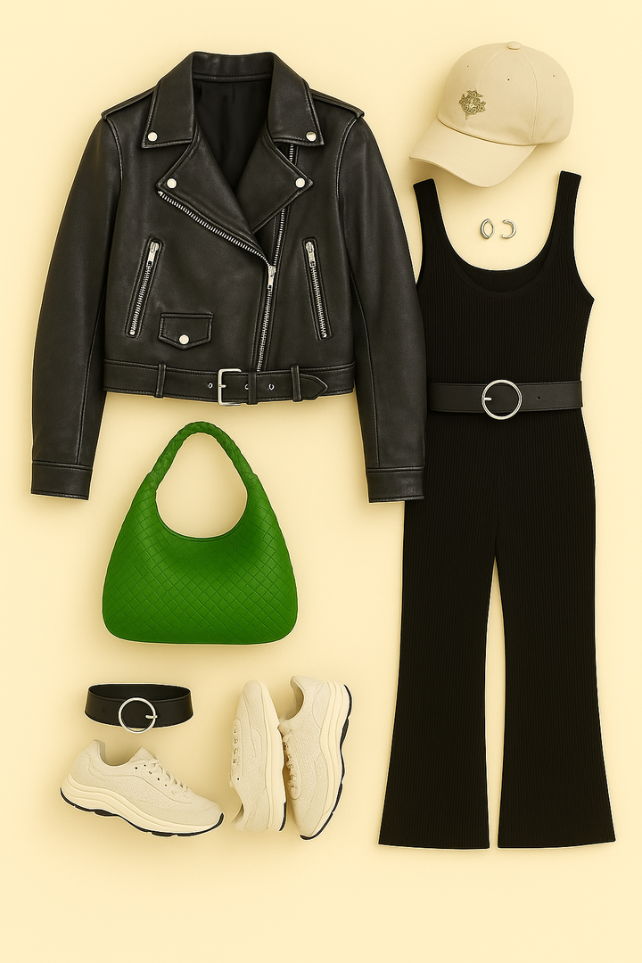 City-brunch energy, zero logos. A cropped black moto over a ribbed flare jumpsuit, grounded with clean cream sneakers and finished with an emerald woven hobo and a minimalist beige cap. Effortless, polished, under-the-radar.