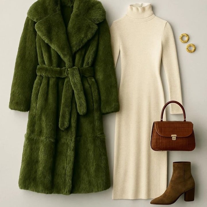 Chalet-to-city in moss + ivory. Plush faux-fur coat over a ribbed turtleneck knit dress, finished with cognac accessories for instant polish.